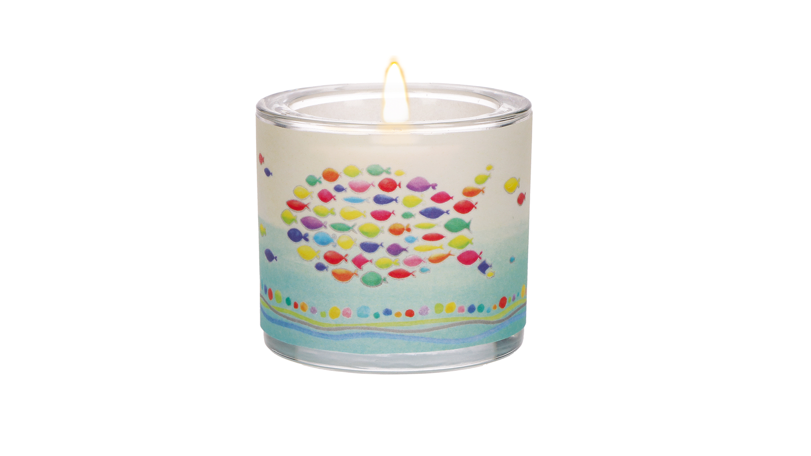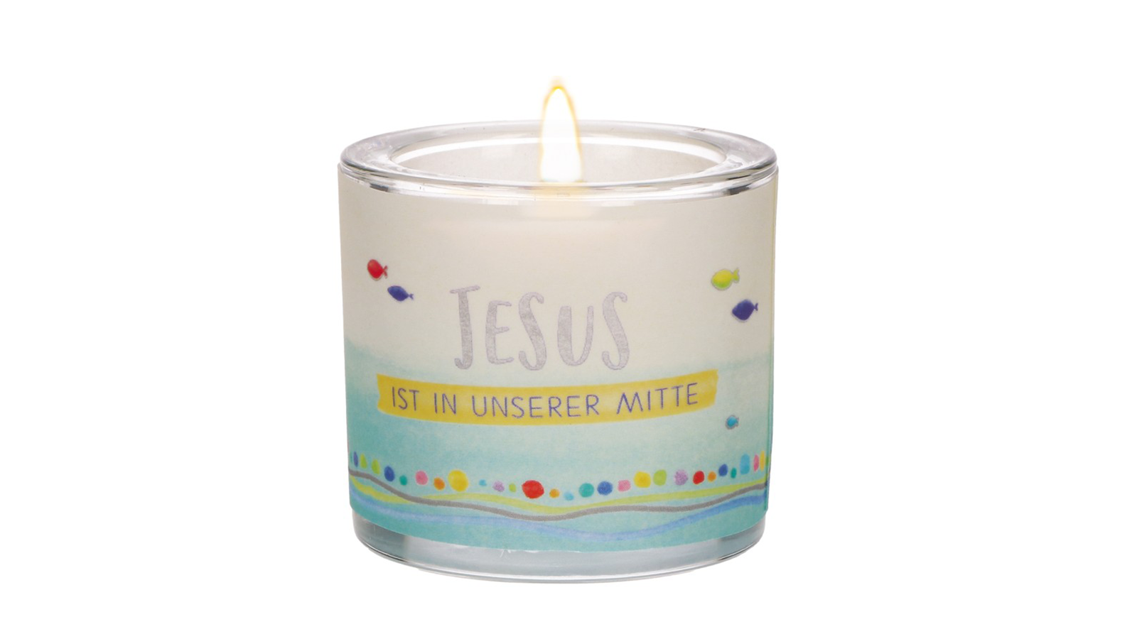 Glaswindlicht mit farbig bedrucktem Pergamentumleger und dem Spruch dem Spruch "Jesus ist in unserer Mitte" inkl.Teelicht, Maße 6,5 x 6 Zentimeter - Lieferung in Geschenkverpackung